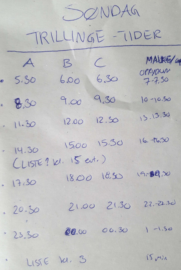 På trillingernes stue lå hver dag en seddel med tider for hvornår mor var der “fra kl. det til kl. det” og hvornår far var der. Og derhjemme lå en seddel med modsat fortegn. Køreturene frem og tilbage mellem OUH og hjem blev brug til “omstilling” – fra den ene virkelighed til den anden. Det var også i den halve time der var tid til at ringe til nogen, brokke sig til kameraet eller bare tude. For når bilen landede hjemme på gårdspladsen så var det med at være til stede og nærværende over for Samuel, Bianca og Gabriel og så havde vi ca. 20 minutter sammen både mor, far og børn – inden at far kørte ind til trillingerne for at nå næste pusletid.
