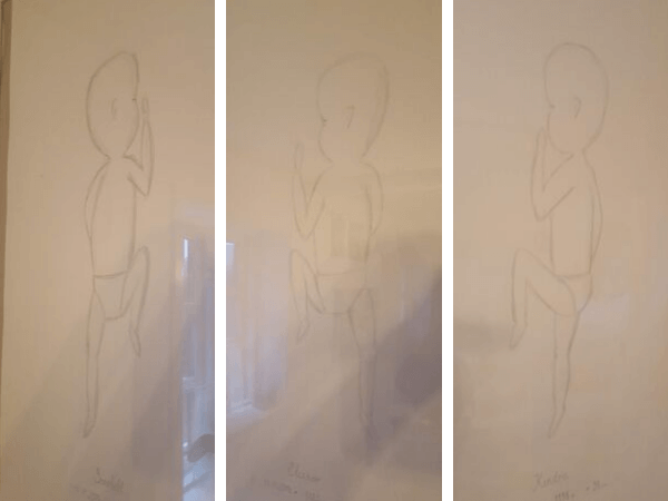 Jeg lavede frihånds blyantstegninger af 3 små babyer i fuld størrelse. Altså de 38-39 cm som de målte da de blev født. Og Martin rammede dem ind så de stod klar til næste morgen.