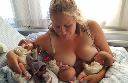 Det fik mig overbevist om, at det kunne lade sig gøre rent fysisk. Jeg havde jo haft masser af mælk til vores tre andre børn, og hvis min krop kunne bygge tre børn, så kunne den vel også lave mælk til tre børn.