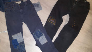 Jeg reparerer gladelidt børnenes tøj! Jeg har brugt lidt af dagen på at reparere Samuels bukser, som alle sammen får huller på knæene. Ud over